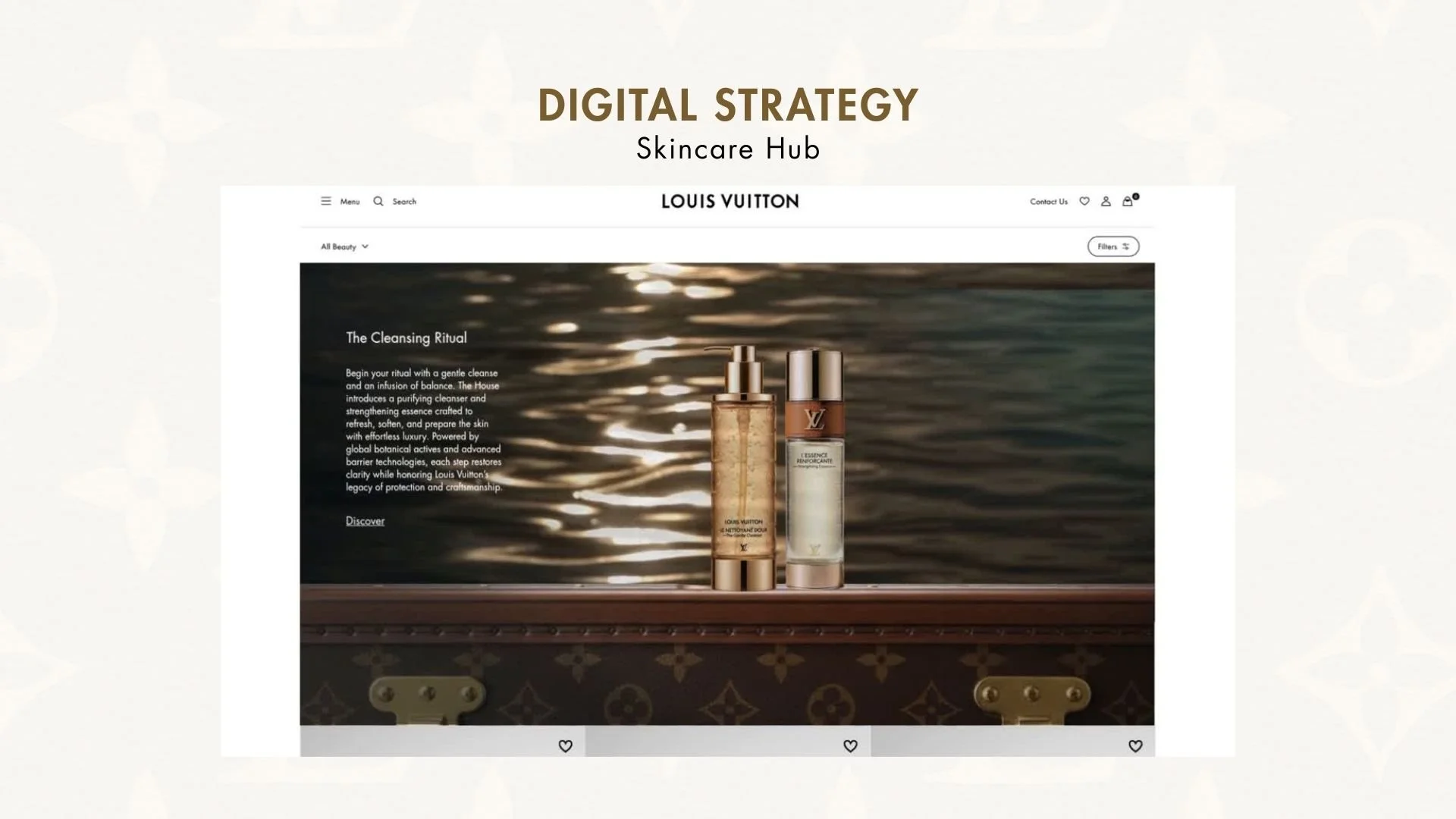 This concept explores how Louis Vuitton could enter luxury skincare through a ritual-driven, digitally led experience. The strategy focuses on translating the brand’s heritage of craftsmanship and protection into a modern beauty ecosystem.